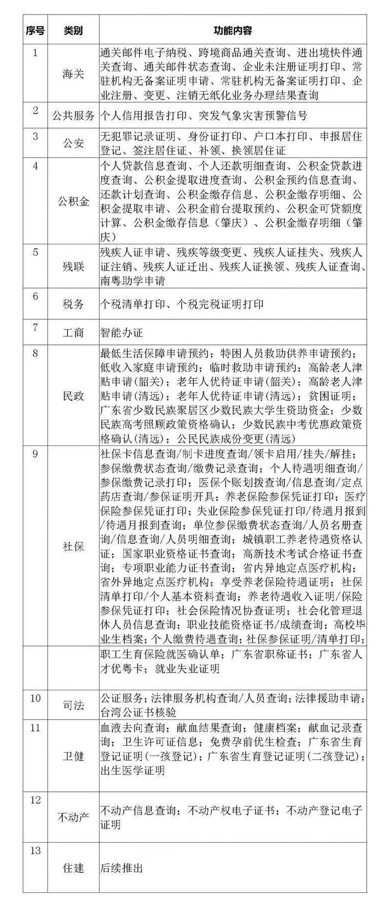 记者从建行广东省分行获悉,本次第一批上线功能涵盖了社保、公积金、工商、税务、公安、残联、司法、不动产、住建、海关、民政、卫健、公共服务等13个大类共113项,包括了身份证及户口簿复印件、出生医学证明、个税完税证明、个人信用报告等高频政务事项,还可提供不动产登记电子证明、不动产权电子证书等实用查询功能。大部分政务服务功能还可以异地办理,便利广大流动人员办理政务业务。