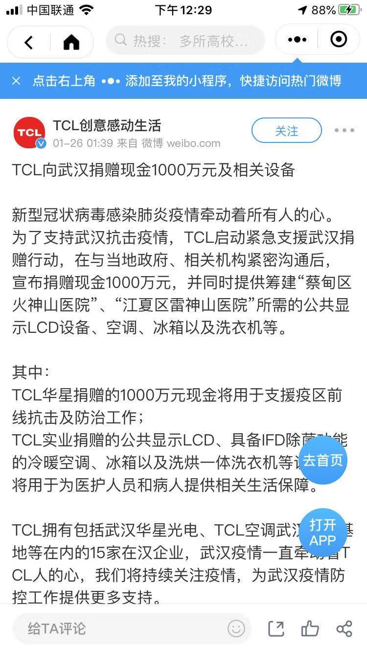 1月26日,TCL宣布向武汉捐赠现金1000万元及电器设备。TCL表示,为了支持武汉抗击疫情,TCL启动紧急支援武汉捐赠行动,在与当地政府、相关机构紧密沟通后,宣布捐赠现金1000万元,并同时提供筹建“蔡甸区火神山医院”、“江夏区雷神山医院”所需的公共显示LCD设备、空调、冰箱以及洗衣机等。