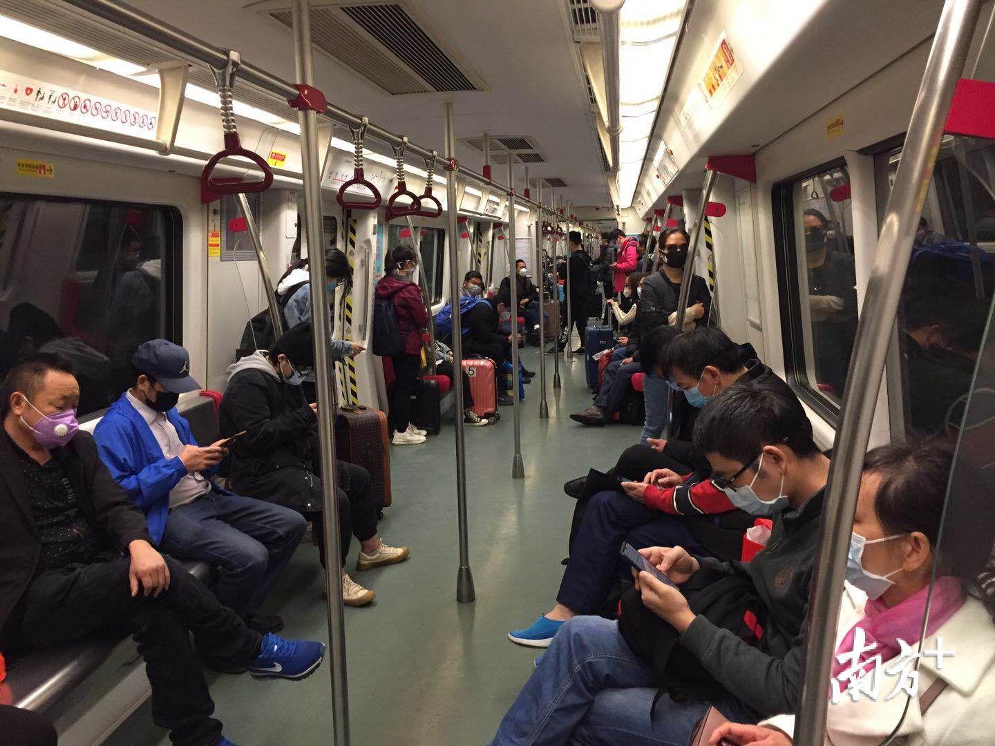 2月10日,广州的各行各业将陆续复工。2月8日,记者走访广州地铁部分站点发现,拉着行李箱返回广州的打工一族明显增多。中午12时许,地铁5号线的列车厢内,乘客的密度有所增大,看不到过去几天一个人可以占一排座位的情况。乘客100%的戴上了口罩,不少人提着行李箱。