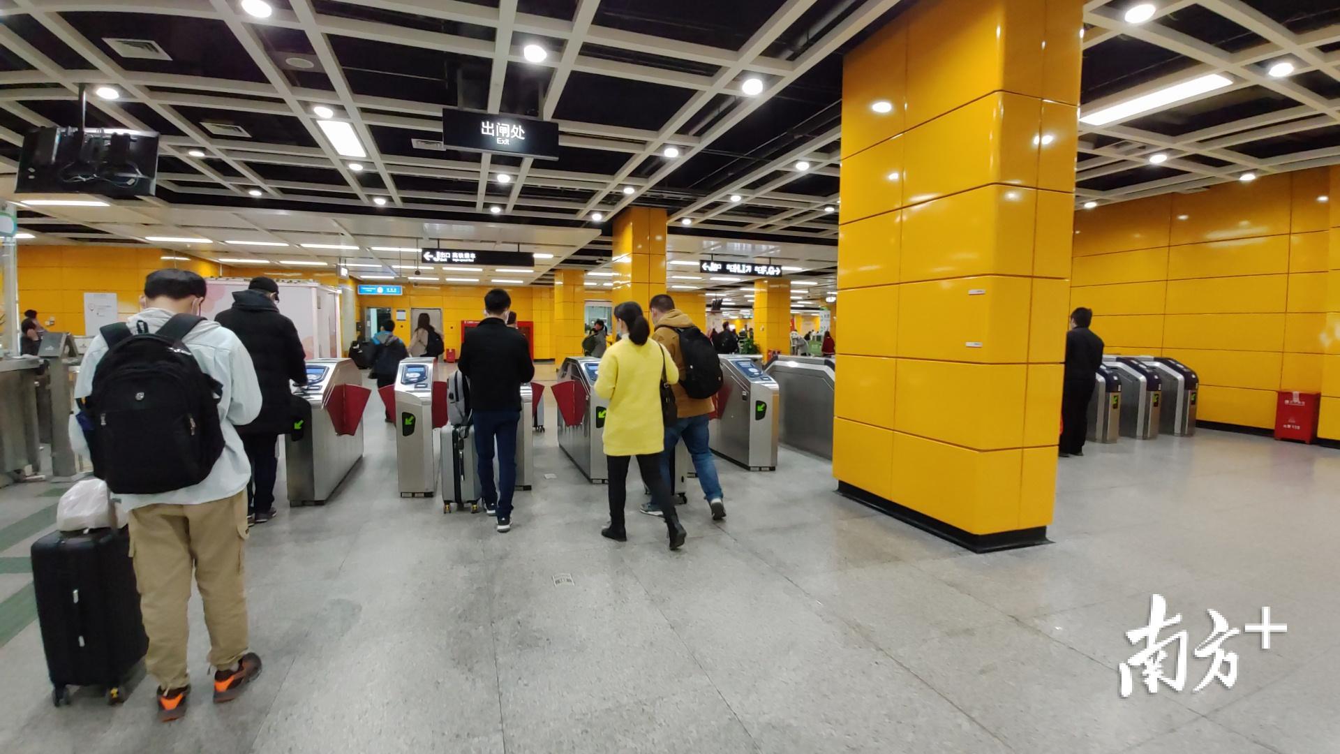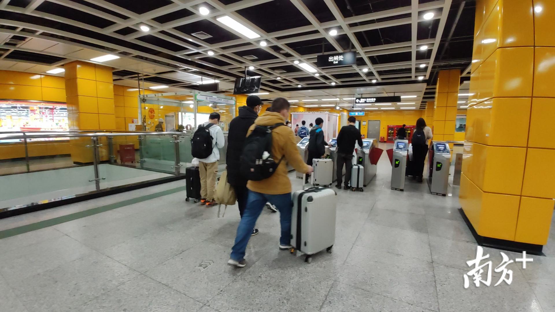 下午4点,在7号线大学城南地铁站,来自广州南站方向的客流从此站转乘4号线前往天河、海珠等地。吴小姐一手提着旅行袋,一手拉着行李箱。“3点左右刚刚从湖南郴州坐高铁到达广州南站,我住在车陂附近,2月10日要正常上班了,明天最后一天假期可能很挤,所以提前一天回来广州。”