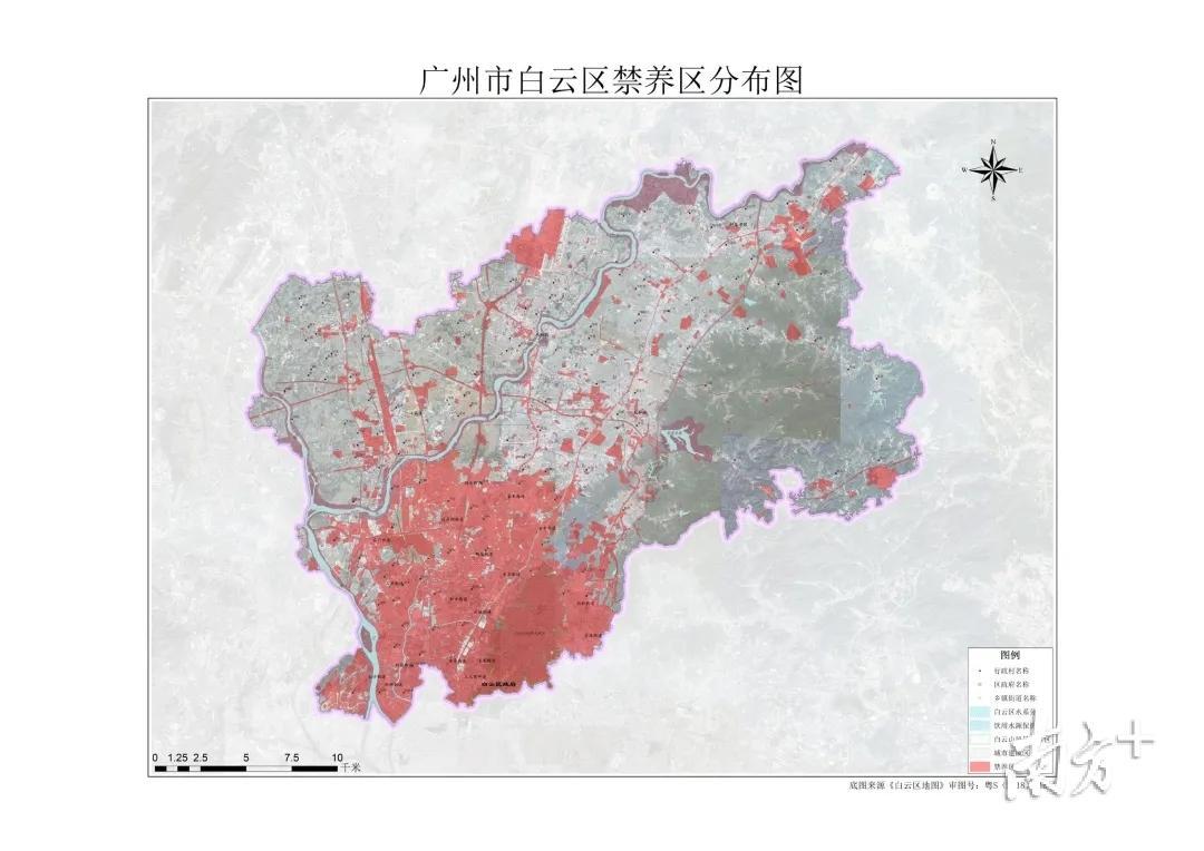 此次禁养区划定主要分布在流溪河、和龙水库、白云山风景区周边等地,包括8个区域:流溪河中下游、白坭河及西航道饮用水源保护区(白云区辖区内);流溪河人和段饮用水源保护区;流溪河竹料段饮用水源保护区;和龙水库饮用水源保护区;流溪河石角段饮用水源保护区(白云区辖区内);流溪河太平、钟落潭段饮用水源保护区(白云区辖区内);白云区辖区内的白云山风景名胜区;以及白云区下辖18个街道和4个镇的城镇建成区。