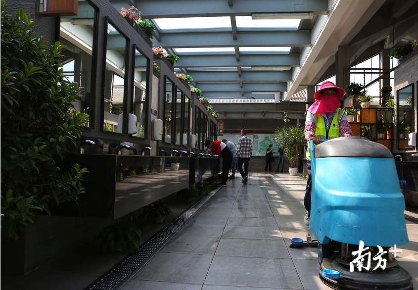 记者现场看到,列好班次的清洁工人推着扫地机、拿着拖把定时清理厕所,“嗡嗡”的地面吹风机吹干地面,以免行人摔倒的同时,也减少了细菌的滋生。
