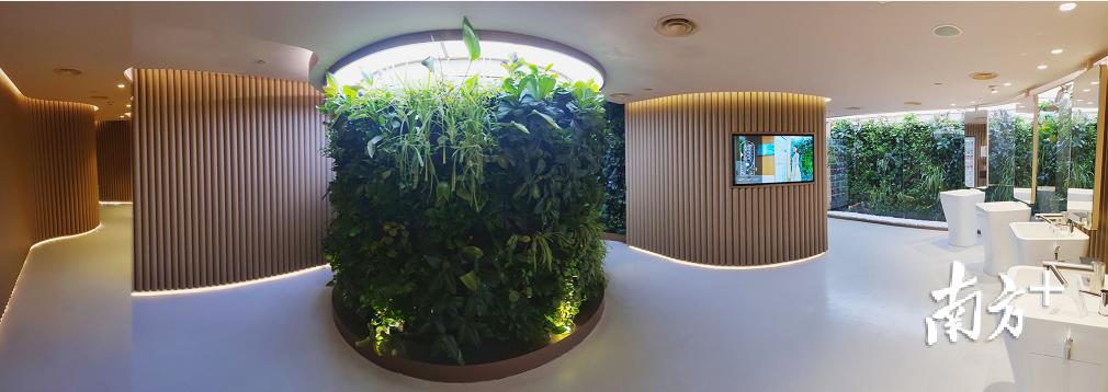 在广州太古汇二楼,沿着纸筒饰面构筑的墙壁进去,一转弯,单向可视节能环保玻璃下封印的植物以生机勃勃的姿态扑向眼球,厕所与曲折的廊道融为一体,浑然天成。