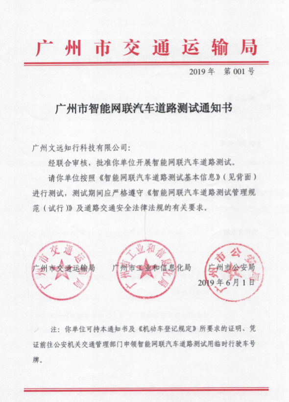6月14日,记者获悉,文远知行、广汽、小马智行、深兰等企业分别收到由广州市政府相关部门颁发的路测通知书,成为首批获得广州市智能网联汽车道路测试资格的企业。