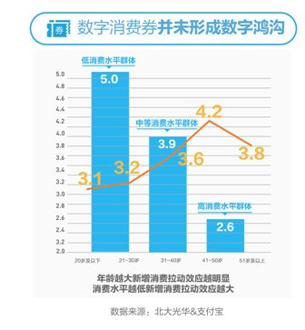 北大光华管理学院和蚂蚁金服研究院的联合研究发现,消费券拉动新增消费最明显的是消费水平较低群体及中老年群体。其中低消费群体拉动效应为5.0倍,高于中等消费水平的3.9倍及高水平的2.6倍;而41—50岁人群的消费拉动效应最高,为4.2倍。“数字消费券体现了公平性和普惠性,让所有市民都可以便捷地获取和使用。”