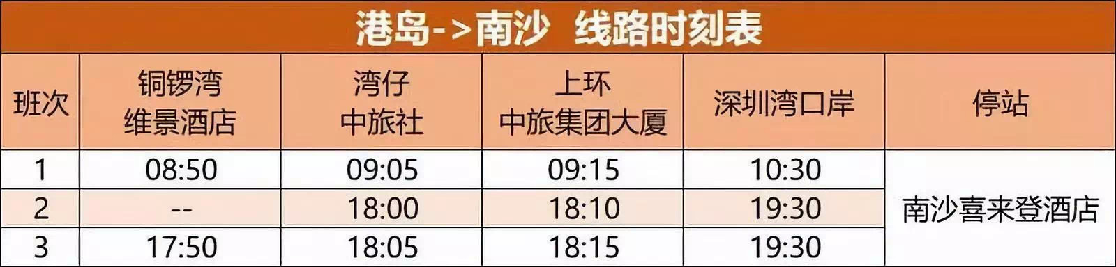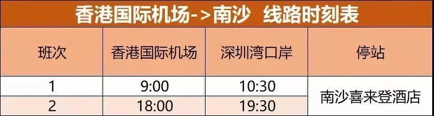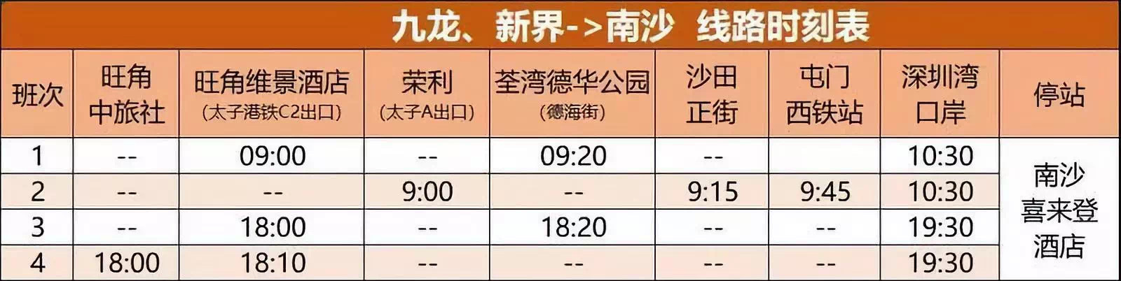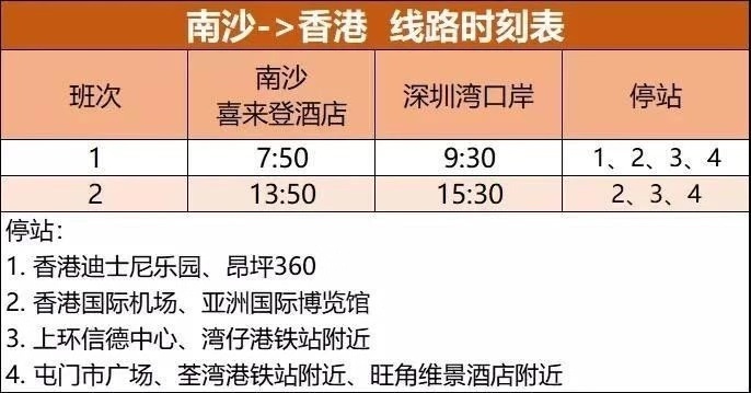目前,南沙至香港发车时间为每日早晨7:50和下午13:50,沿途可停靠香港迪士尼乐园、昂坪360、香港国际机场、亚洲国际博览馆、上环信德中心、湾仔港铁站、屯门市广场、荃湾港铁站、旺角维景酒店等地。香港居民亦可在上述站点乘坐巴士。